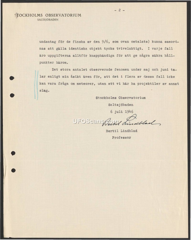 This document is a brief correspondence from the Stockholm Observatory, dated July 6, 1946, and signed by Professor Bertil Lindblad. The text addresses the difficulty of coordinating reports of observed phenomena from May and June 1946, specifically noting that the available data is too sparse to definitively categorize the objects as identical. Despite this lack of data, Professor Lindblad explicitly states his professional opinion that the large number of phenomena observed during these months cannot be attributed to meteors. Instead, he concludes that the observations represent projectiles of another nature.