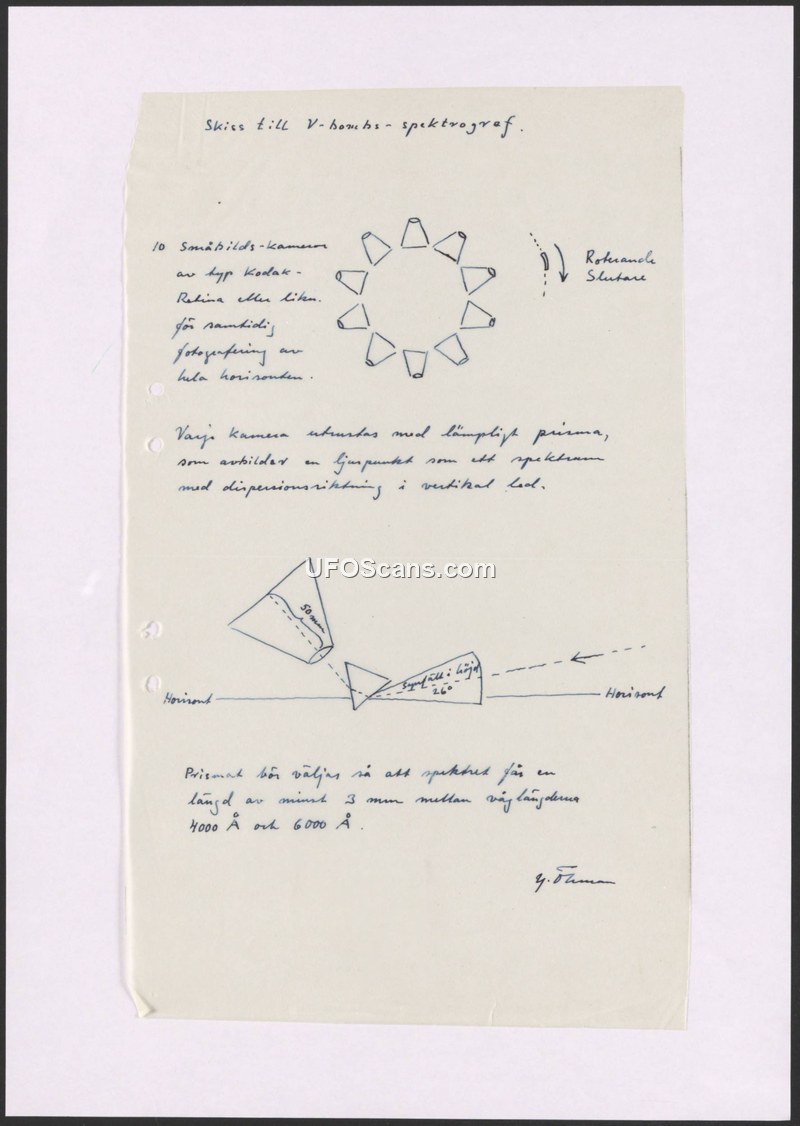 This document is a technical sketch and set of instructions authored by G. Ohman regarding the design of a spectrograph system intended for monitoring V-bombs. The system utilizes ten cameras, specifically identified as Kodak Retina or similar models, arranged in a circular configuration to allow for the simultaneous photography of the entire horizon. The design incorporates prisms for each camera, which are intended to capture light points and convert them into spectra with vertical dispersion. The author provides a specific technical requirement for the prism, stating that it must be chosen to ensure the resulting spectrum has a length of at least 3 mm between the wavelengths of 4000 Å and 6000 Å. The document includes a diagram illustrating the camera arrangement, the rotating shutter mechanism, and the optical path of the light through the prism relative to the horizon.