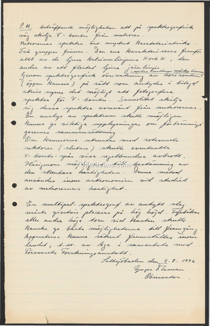 This memorandum, dated August 2, 1946, and written by an observer named Zygmunt [illegible] from Saltsjöbaden, addresses the technical challenge of distinguishing V-bombs from meteors using spectrographic methods. The author notes that meteor spectra are highly characteristic, typically defined by calcium lines. The author posits that by utilizing an open camera setup, as suggested in an attached sketch, it is possible to capture the spectra of V-bombs, which would likely differ significantly from those of meteors. Such an analysis could provide critical information regarding the composition of the gases involved. Additionally, the author proposes that if cameras were equipped with rotating shutters, it would be possible to observe regular interruptions in the V-bomb's trail, thereby allowing for the calculation of its speed—a technique already established in astronomical studies of meteors. The author concludes by suggesting that multiple spectrographs of this type should be placed at high altitudes, and that the necessary equipment could be manufactured domestically, specifically mentioning a potential collaboration between the company Aga and the National Defence Research Institute (Försvarets Forskningsanstalt).