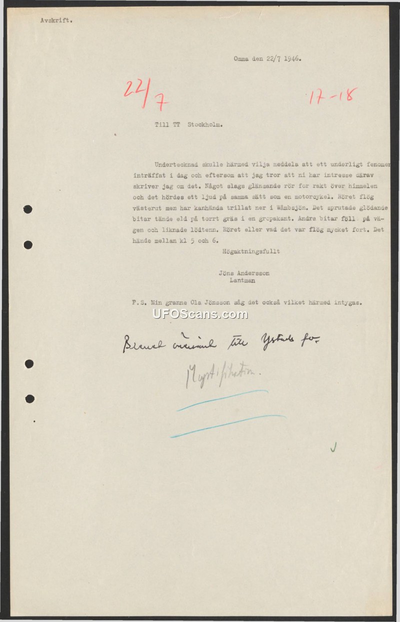 On July 22, 1946, Jöns Andersson, a farmer in Omma, Sweden, submitted a report to TT Stockholm regarding an unusual aerial phenomenon he witnessed between 5:00 and 6:00 PM. Andersson described observing a shiny, tube-like object flying at high speed in a straight line toward the west. He noted that the object produced a sound similar to that of a motorcycle. According to the report, the object ejected glowing fragments; some of these fragments ignited dry grass at the edge of a pit, while others landed on a road and were described as resembling solder. Andersson speculated that the object might have crashed into the nearby lake, Wåmbsjön. He further stated that his neighbor, Ola Jönsson, also witnessed the event and could corroborate his account.