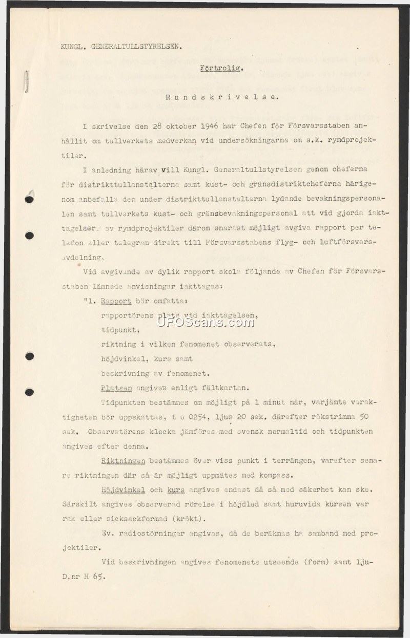 A 1946 Swedish customs circular establishing reporting protocols for 'space projectiles' to the Defence Staff. It provides specific guidelines for documenting sightings, including time, location, trajectory, and associated phenomena like radio interference.