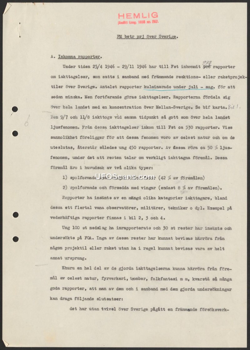 A 1946 Swedish military memorandum documenting 973 reports of aerial phenomena. It concludes that foreign experimental activity was occurring over Sweden after physical remnants could not be identified as known rockets or projectiles.
