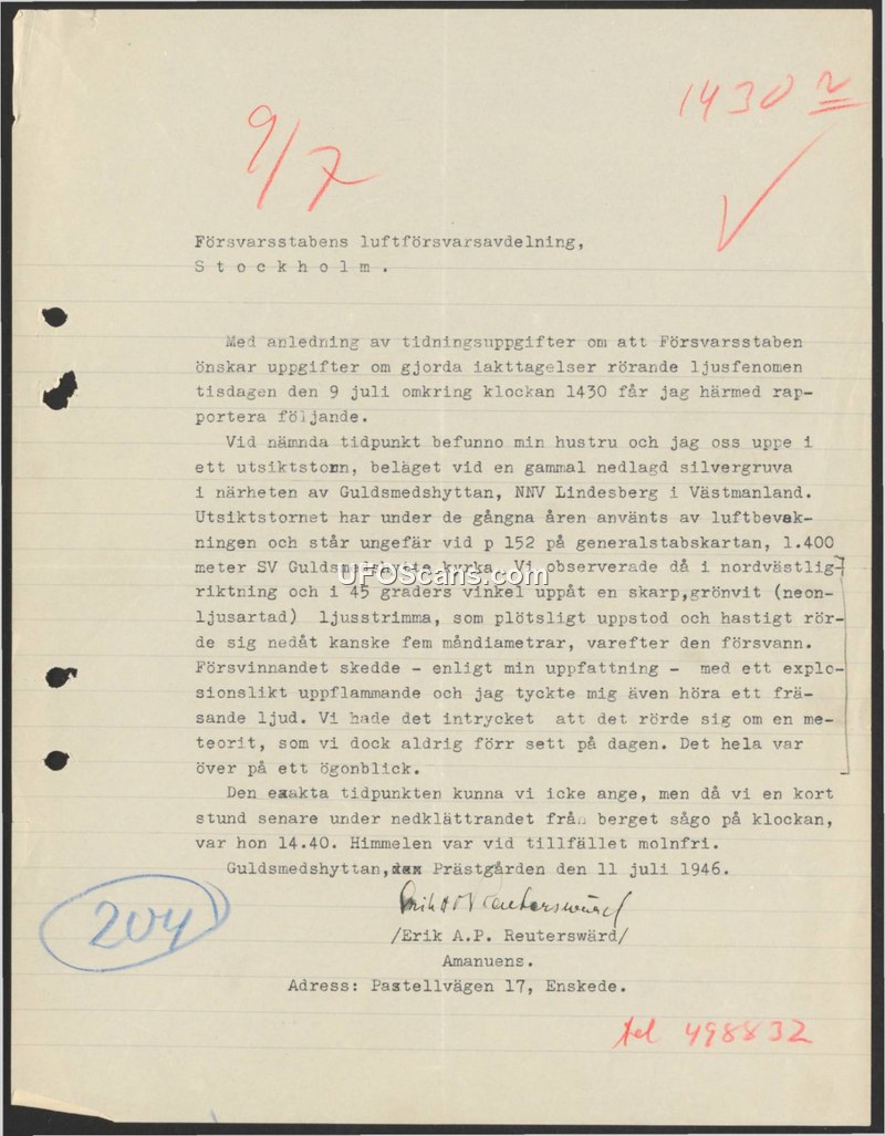 On July 11, 1946, Erik A.P. Reuterswärd, an amanuensis, submitted a report to the Swedish Defense Staff's Air Defense Department regarding a light phenomenon he and his wife observed on July 9, 1946. At approximately 14:30, while positioned in an observation tower at an abandoned silver mine near Guldsmedshyttan, Lindesberg, the couple witnessed a sharp, green-white, neon-like streak of light. The object appeared suddenly in a north-westerly direction at a 45-degree upward angle. It moved rapidly downward for a distance estimated by the witness as five moon diameters before vanishing. The disappearance was accompanied by an explosion-like flare and a hissing sound. The witness remarked that the event gave the impression of a meteorite, though he noted he had never observed such a phenomenon during daylight hours before. The entire event lasted only an instant. The witness confirmed the sky was cloudless at the time and noted that they checked the time shortly after the event while descending the mountain, confirming it was 14:40.