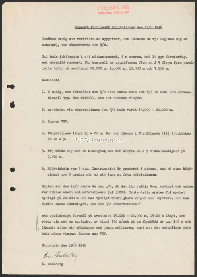 This report, dated August 19, 1946, details an investigation conducted at Mällsten on August 12, 1946, to verify a sighting of a 'rocket projectile' reported by a conscript named Haglund on August 5, 1946. The original observation was made using a 4-meter stereo measuring instrument with 28x magnification. To test the reliability of the observation, a J 9 aircraft performed four parallel flights at distances of 20,000, 15,000, 10,000, and 7,500 meters. The investigator, E. Malmberg, concluded that the object observed on August 5th could not have been a conventional aircraft. Key characteristics noted include a spindle-shaped body, a length of 15-20 meters, a speed of at least 350 meters per second, and an altitude of approximately 100 meters. The object reportedly left smoke rings at regular intervals and appeared to lack wings. Despite poor visibility conditions on the day of the verification, the J 9 aircraft was clearly distinguishable, which the investigator used to support the conclusion that the original sighting was of an unconventional object.