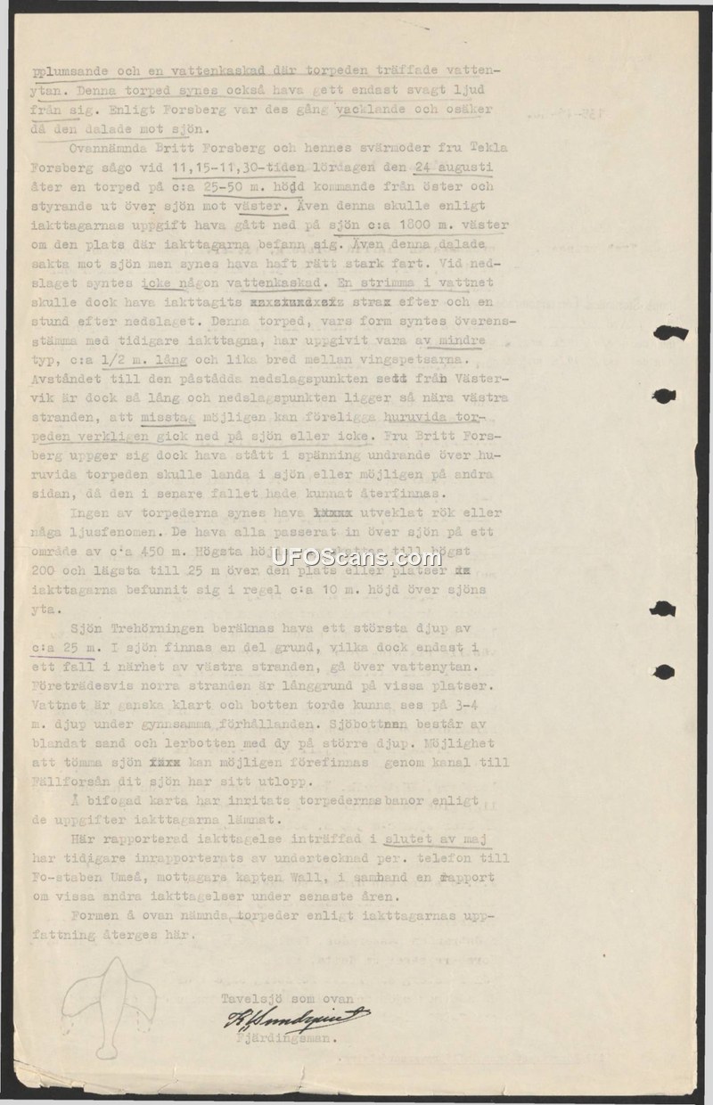 The report details sightings of torpedo-like objects entering Lake Trehörningen. The author notes that due to the distance from the observation point at Väster-vik, it is difficult to confirm if the objects actually entered the water or landed on the shore.