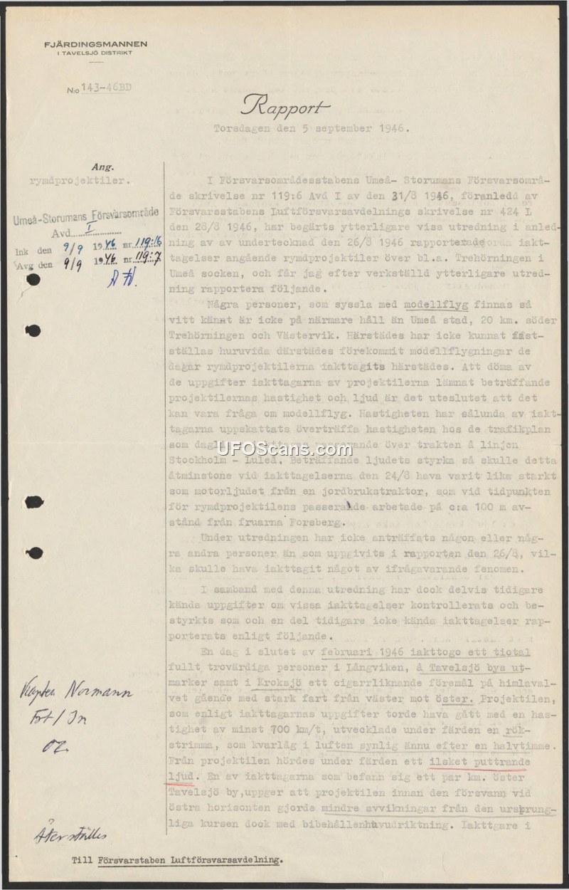 This report, dated September 5, 1946, from the Fjärdingsman (district constable) of Tavelsjö, details an investigation into reports of 'space projectiles' (rym dprojektiler) over the Umeå-Storuman defense area. The investigation was initiated following previous correspondence from the Defense Staff's Air Defense Department. The report addresses concerns regarding whether these sightings could be attributed to model aircraft. The author concludes that model aircraft are an unlikely explanation, citing the high speed of the objects—estimated at at least 700 km/h—and the intensity of the sound produced, which was compared to a tractor engine. The report also documents a specific sighting from late February 1946, where ten credible witnesses in Långviken, Tavelsjö, and Kroksjö observed a cigar-shaped object traveling from west to east. This object reportedly left a smoke trail that remained visible for half an hour and emitted an 'angry sputtering sound.' One witness noted that the object made minor course deviations before disappearing over the eastern horizon. The author notes that no other witnesses were found during the investigation, but the report serves to consolidate and confirm previously known and newly reported observations.