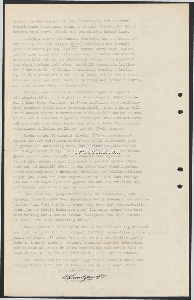 This document is a field report detailing several sightings of unidentified aerial projectiles in the vicinity of Långviken, Sweden. The report chronicles observations made between February and August. In mid-May, Ludvig Johansson reported hearing a strong buzzing sound and observing a smoke trail in the sky, though the object itself was not seen. A similar phenomenon was observed by Oskar Karlsson and four family members at the turn of June and July, where a smoke trail formed from a narrow beam that widened over time, lasting 30 to 40 minutes. On August 15, at 21:15, Gunborg Ludvigsson observed a cigar-shaped object approximately one meter long with a glowing red-yellow tail, which she described as resembling a squirrel's tail. The object moved at high speed toward the northeast before disappearing behind trees. Later, a worker from Trehörningen reported that the object seen in February had a glowing core at its tip and that the resulting smoke trail descended to an altitude of approximately 100 meters before fading. The author, Järdingman, concludes by stating that any further relevant information will be reported as it becomes available.