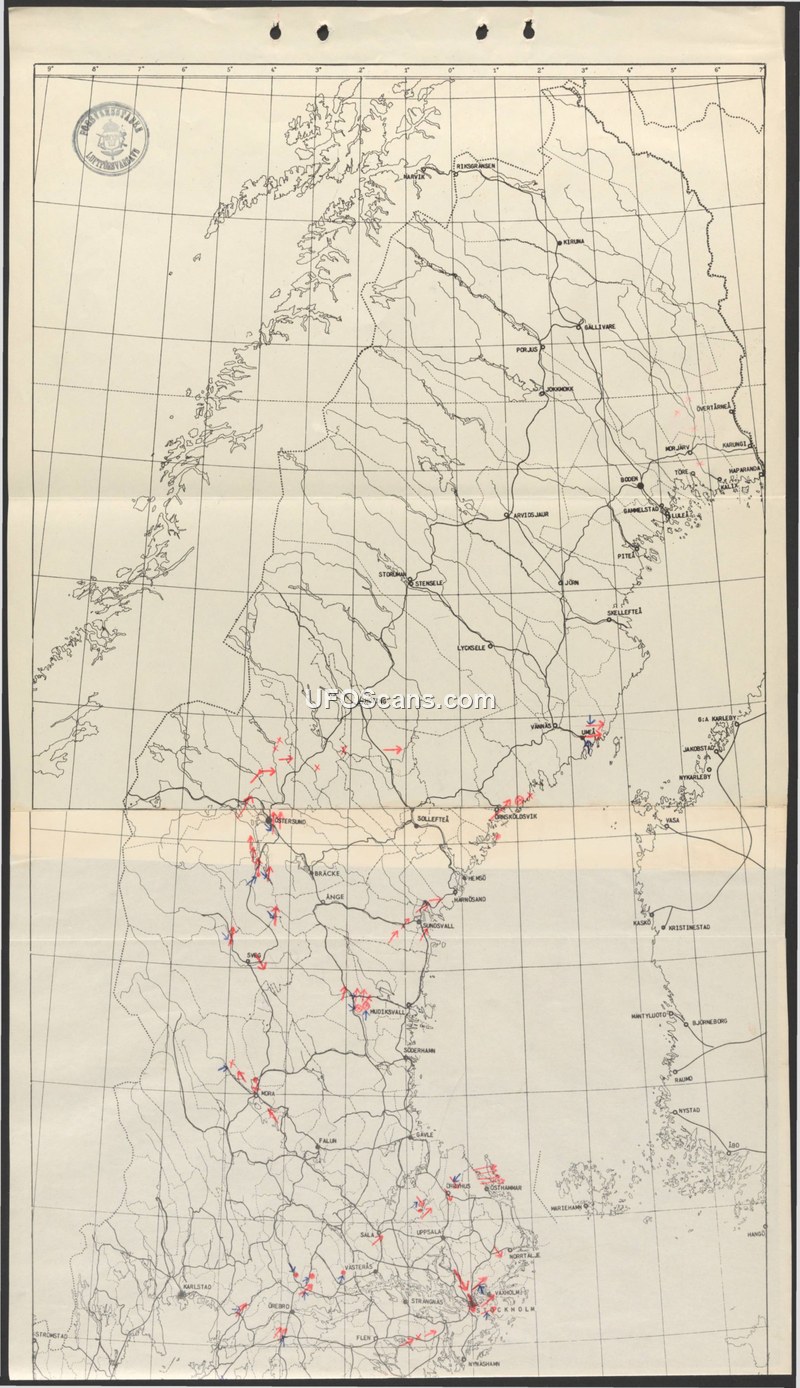 A map of Sweden produced by the Air Defense Bureau featuring hand-drawn directional arrows indicating flight paths. The document provides a visual record of movement patterns across the country without accompanying textual data.