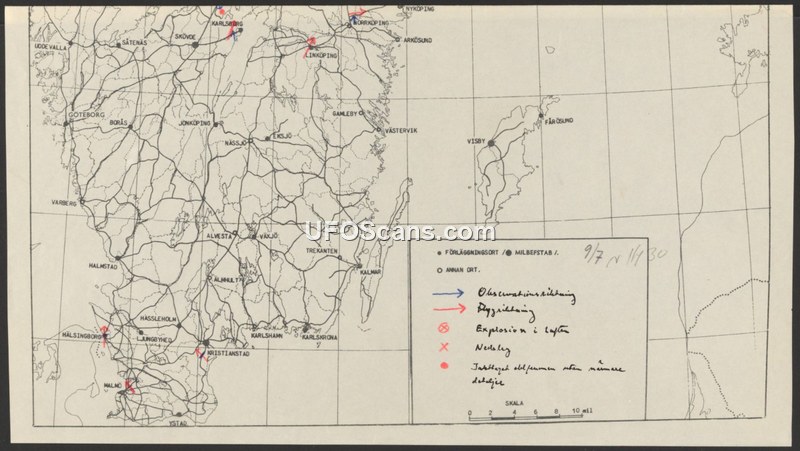 A Swedish military map dated 9/7 at 1430, featuring handwritten annotations for observations, flight paths, explosions, and impacts. It serves as a visual record of military or aerial activity across Sweden.