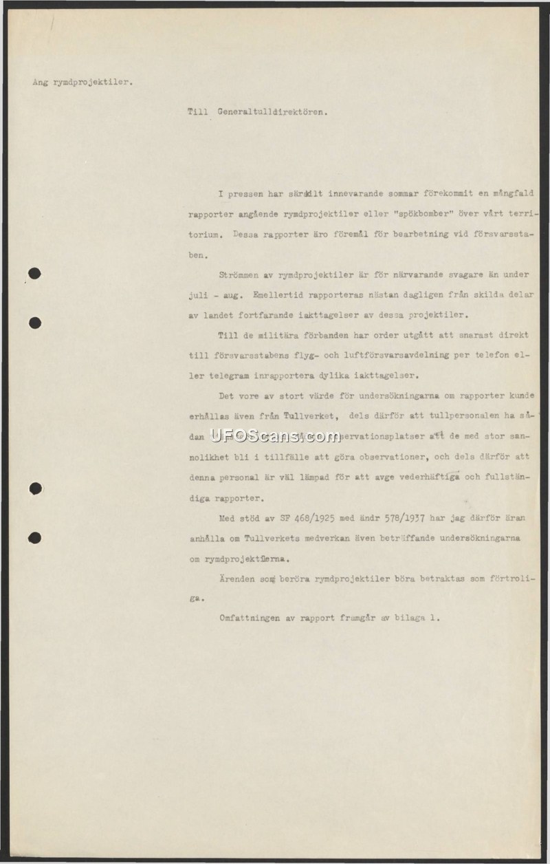 This document is a formal request addressed to the Director General of the Customs Service (Generaltulldirektören) regarding the ongoing phenomenon of 'space projectiles' or 'ghost bombs' (spökbomber) observed over Swedish territory. The author notes that throughout the current summer, numerous reports of these objects have appeared in the press and are currently being processed by the Defense Staff (Försvarsstaben). While the frequency of these sightings has decreased since July and August, reports continue to arrive from various parts of the country on a near-daily basis. Military units have already been ordered to report such sightings immediately to the Air and Air Defense Department of the Defense Staff via telephone or telegram. The author argues that it would be of great value to the ongoing investigations if the Customs Service also participated in this reporting effort. This is based on the belief that customs personnel, due to their specific duties and the locations of their observation posts, are highly likely to witness these phenomena and are well-suited to provide credible and complete reports. The request is made with reference to regulations SF 468/1925 and its amendment 578/1937. Finally, the document stipulates that all matters concerning these space projectiles must be treated as confidential, and refers to an attached document (bilaga 1) for further details on the scope of the reporting requirements.