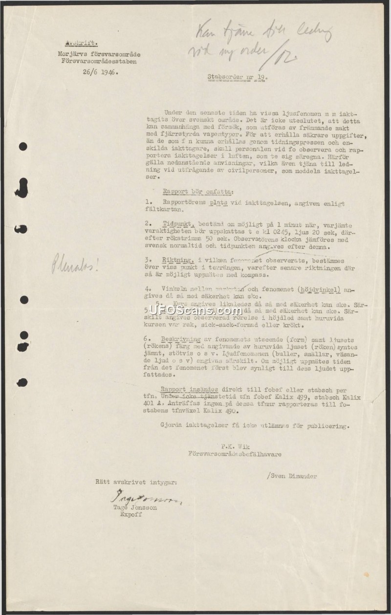 A 1946 Swedish military order establishing a formal reporting protocol for aerial phenomena, suspected to be foreign remote-controlled weapons. It mandates specific data collection points for military personnel and prohibits public disclosure of these sightings.