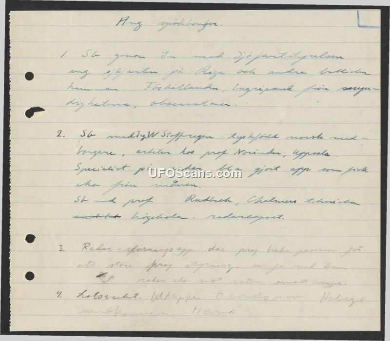 This document consists of four brief, handwritten notes in Swedish regarding unidentified aerial phenomena and radar-related issues. The first point mentions contact with intelligence regarding sightings in Riga and other Baltic ports. The second point introduces a German-born Norwegian radar specialist named Stoffregen, who works for Professor Norinder in Uppsala, and notes his expertise in radar echoes. It also mentions a connection to Professor Rudbeck at Chalmers University of Technology, who is identified as a radar expert. The third point discusses radar interference affecting project control and radar echoes against water. The final point is partially illegible but references a location, possibly Olands or similar.