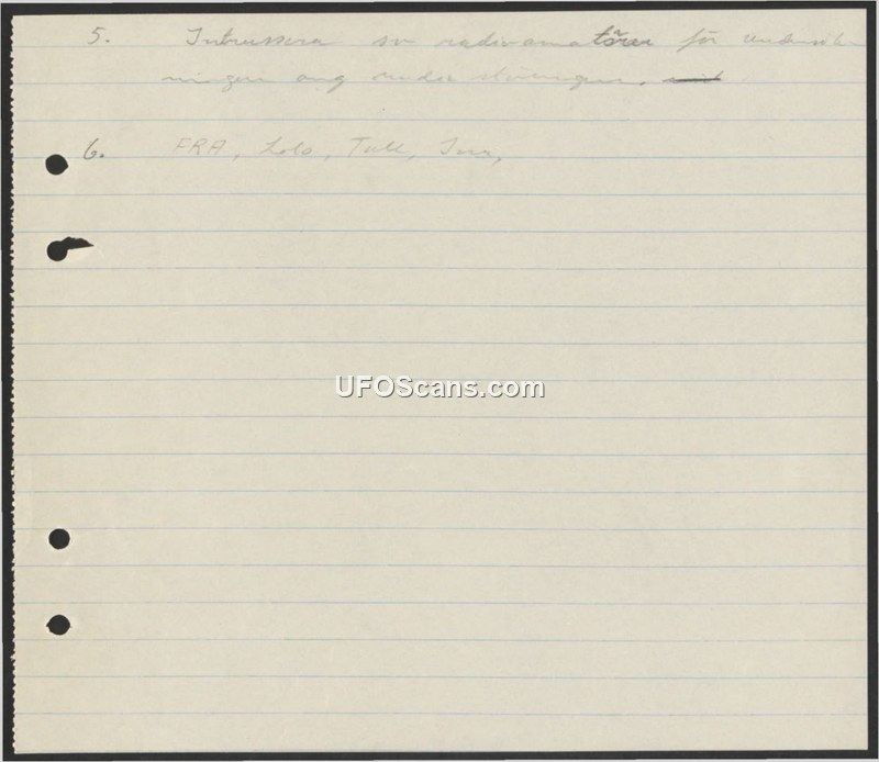 This document consists of two numbered points written in Swedish. Point 5 suggests engaging radio amateurs for investigations regarding the phenomenon. Point 6 lists the organizations FRA (Försvarets radioanstalt), Lolo, and Tull (Swedish Customs).