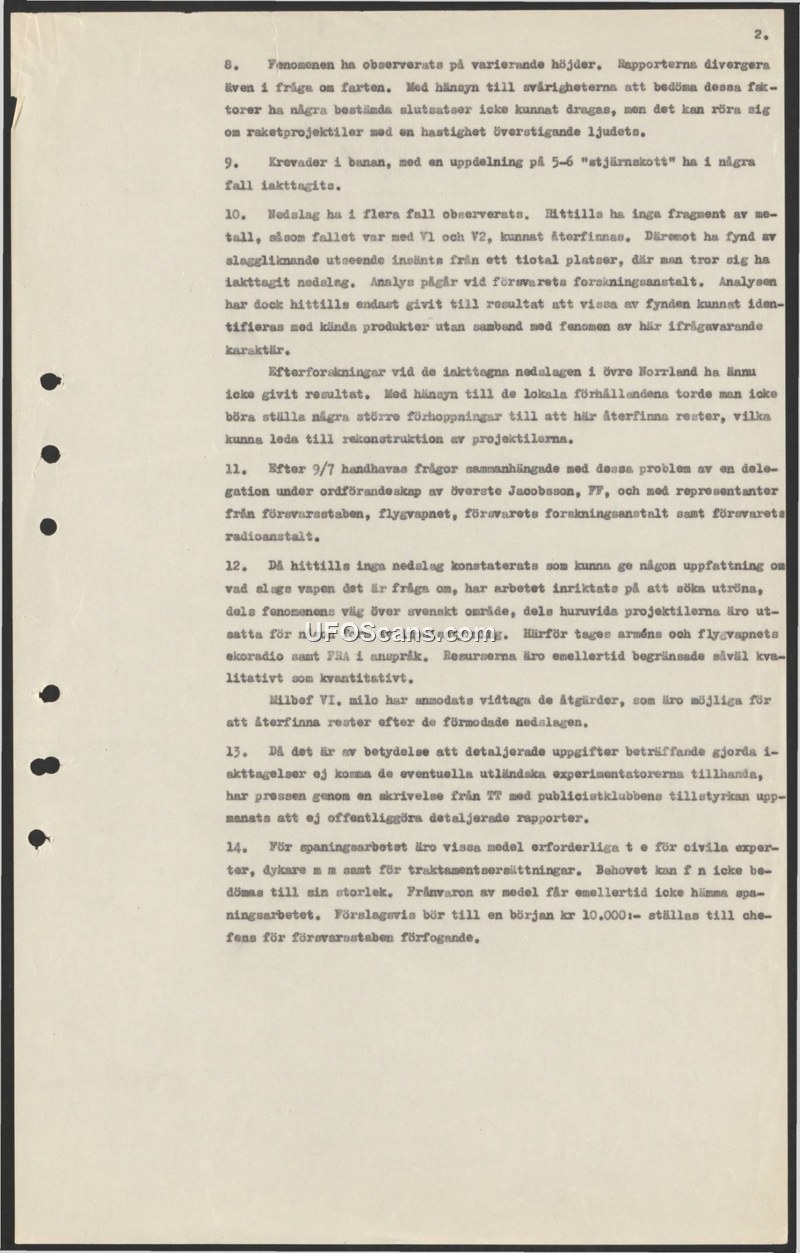 This document, likely a Swedish military report, outlines the ongoing investigation into unidentified aerial phenomena observed over Sweden. The phenomena have been noted at varying altitudes and speeds, with some reports suggesting speeds exceeding the speed of sound. In certain instances, observers reported the objects breaking apart into 5-6 'star shots.' While several crash sites have been reported, no metallic fragments comparable to V1 or V2 rockets have been recovered. Instead, slag-like materials have been collected from approximately ten sites and are currently under analysis by the defense research institute. Investigations in Upper Norrland have so far been unsuccessful, and the report notes that local conditions make the recovery of wreckage unlikely. As of July 9, a delegation led by Colonel Jacobsson, including representatives from the defense staff, air force, and research institutes, has been tasked with managing these issues. The investigation is currently focused on determining the flight paths of these objects and whether they are subject to any form of impulse control. The military is utilizing radar and radio intelligence for this purpose, though resources are described as limited. Local military commanders have been instructed to recover any potential debris. Furthermore, to prevent sensitive information from reaching foreign experimenters, the press has been asked to refrain from publishing detailed reports. The document concludes by requesting an initial allocation of 10,000 SEK to support the investigation, including the hiring of civilian experts and divers.