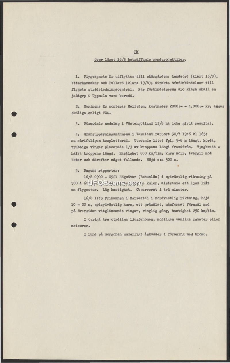 A 1946 Swedish military memorandum detailing operational responses to 'space projectiles' and summarizing multiple sightings of unidentified aerial objects across Sweden.