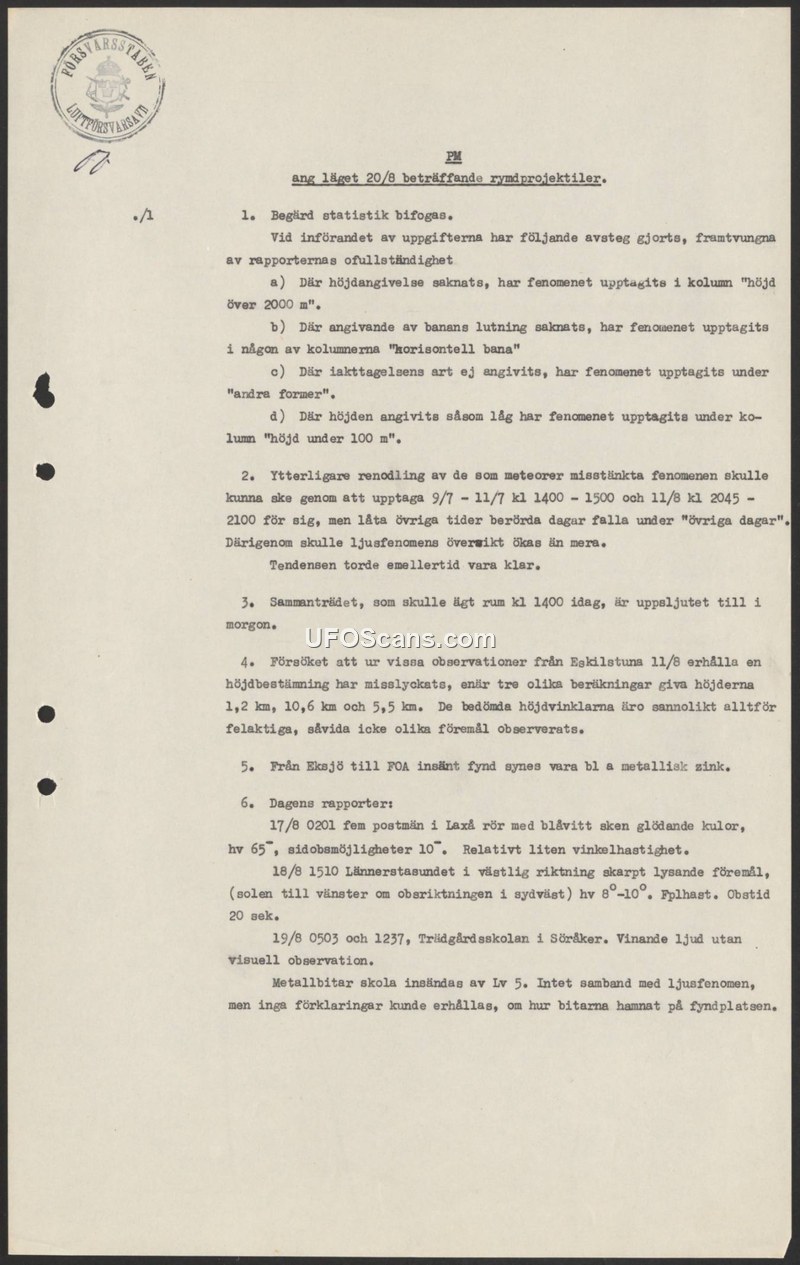 This memorandum, dated August 20, 1947, from the Swedish Defence Staff (Försvarsstaben), provides an update on the status of 'space projectiles' (rymdprojektiler). The document outlines the methodology used to process sighting reports, noting that due to the incompleteness of the data, certain assumptions were made to categorize observations, such as assigning missing altitude data to a 'greater than 2000m' column. The author discusses the ongoing effort to isolate potential meteor sightings from other phenomena by grouping specific time intervals. A meeting originally scheduled for the day of the report was postponed until the following day. The document highlights a failed attempt to determine the altitude of objects observed in Eskilstuna on August 11, as three separate calculations yielded vastly different results (1.2 km, 10.6 km, and 5.5 km), suggesting either significant errors in angular estimation or the observation of multiple distinct objects. The report also mentions that physical evidence, specifically metallic pieces identified as potentially metallic zinc, was sent to the FOA (Swedish Defence Research Agency) from the Lv 5 military unit. While the author notes there is no confirmed connection between these metallic pieces and the reported light phenomena, they acknowledge that no explanation could be found for how the pieces arrived at the site. Finally, the document lists three specific reports from August 17, 18, and 19, involving sightings of glowing blue-white spheres, sharp light objects, and reports of whining sounds without visual confirmation.