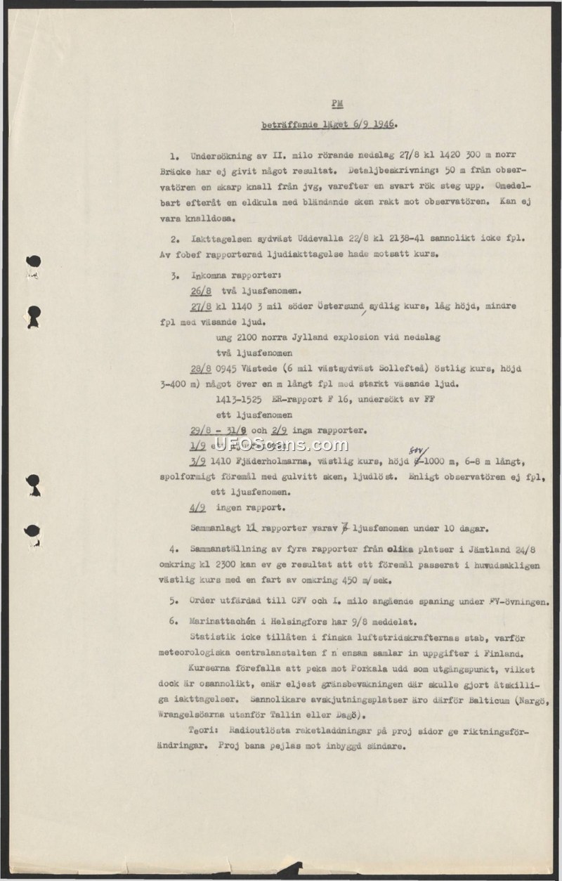 This memorandum, dated September 6, 1946, provides a summary of reports concerning unidentified aerial phenomena observed in Sweden and Finland over a ten-day period. The document details several specific incidents, including a sighting near Bräcke on August 27, where an observer reported a sharp bang followed by black smoke and a fireball moving directly toward them. Other reports include sightings of light phenomena, objects with hissing sounds, and a silent, spindle-shaped object observed near Fjäderholmarna on September 3. The author notes that a compilation of four reports from Jämtland on August 24 suggests an object traveling on a westerly course at approximately 450 meters per second. The document also addresses the difficulty of gathering data in Finland, noting that the Finnish Air Force staff does not permit statistics, leaving the meteorological central institute as the sole collector of information. Regarding the origin of these phenomena, the author dismisses Porkala udd as a likely launch site, suggesting instead that the Baltic region—specifically Nargö, the Wrangels islands, or Dagö—is more probable. The document concludes with a theory that the objects are radio-triggered rocket charges capable of course changes, with their flight paths tracked by internal transmitters.
