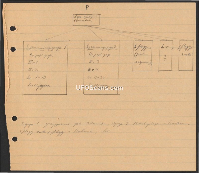 This document is a handwritten organizational chart detailing the structure of two surveillance groups, identified as Spaningsgrupp 1 and Spaningsgrupp 2. The chart illustrates a central command structure branching into these two primary groups. Spaningsgrupp 1 is associated with units labeled Er1, Er2, and ls 1-10, while Spaningsgrupp 2 is associated with Er3, Er4, and ls 11-20. Additionally, the chart lists auxiliary units including Sflyg (air surveillance) and Lv (anti-aircraft). A note at the bottom of the page clarifies the geographic distribution of these units, stating that Spaningsgrupp 1 is located on the island of Öland, while Spaningsgrupp 2 is located in Mörbylånga-Torslunda. The air surveillance and anti-aircraft units are noted as being located in Kalmar.