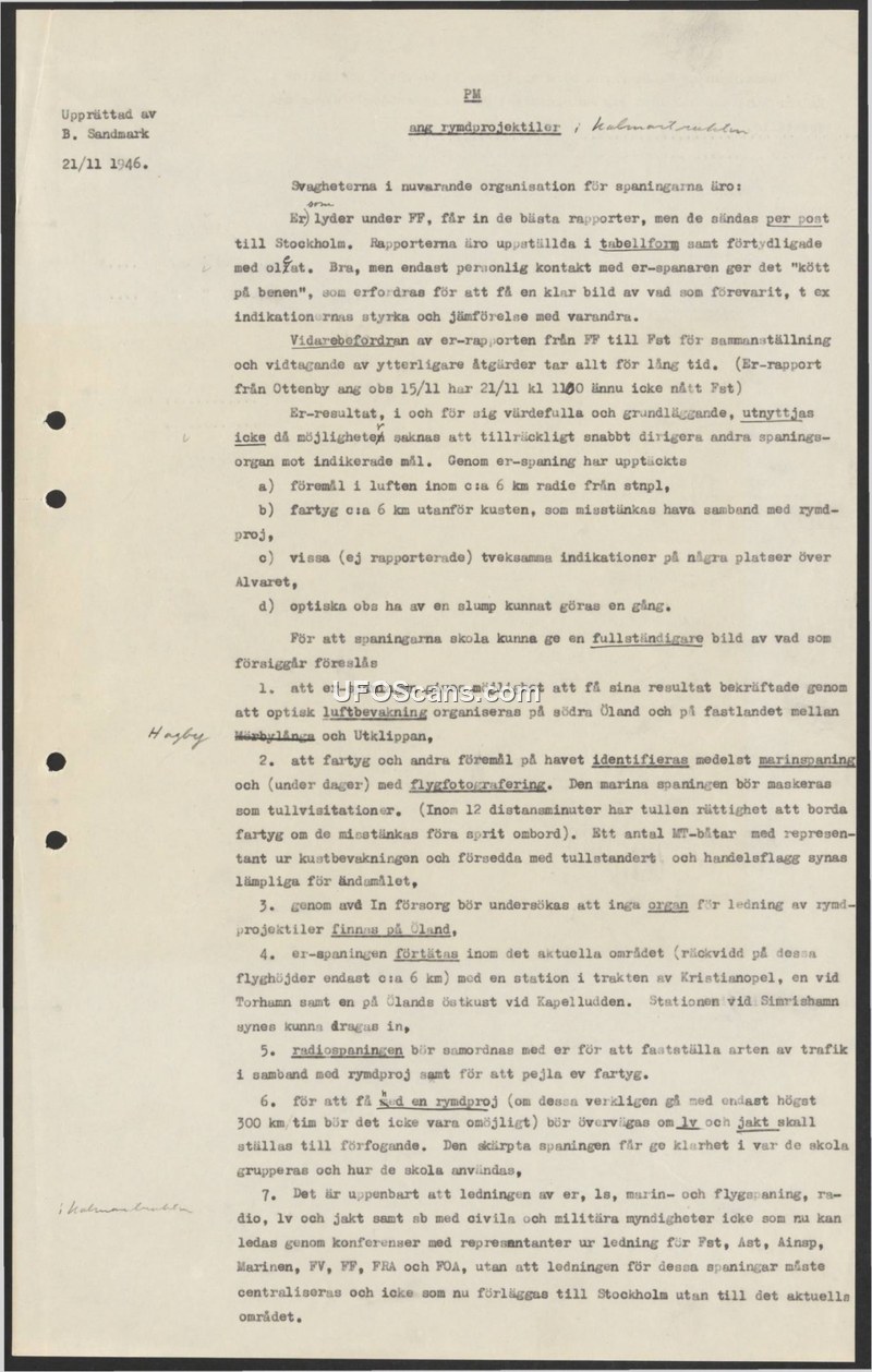 This memorandum, dated November 21, 1946, and authored by B. Sandmark, outlines critical deficiencies in the Swedish military's organization for monitoring 'space projectiles' (rymdprojektiler). The author highlights that while the current monitoring units (er-spaning) produce valuable reports, the reliance on mailing these reports to Stockholm for compilation results in unacceptable delays. For instance, a report from Ottenby regarding observations made between November 15 and November 21 had not yet reached the Defense Staff (Fst) by the time of the memo. The author notes that the current system fails to utilize the potential for rapid direction of monitoring assets toward targets. Observations have included objects in the air within a 6 km radius of stations, ships suspected of being linked to the projectiles, and unconfirmed indications over the Alvaret area. To address these issues, the author proposes seven specific measures: 1) establishing optical air surveillance on southern Öland and the mainland; 2) identifying sea vessels through marine surveillance and aerial photography, potentially disguised as customs inspections; 3) investigating the presence of guidance organs on Öland; 4) densifying the monitoring network with new stations at Kristianopel, Torhamn, and Kapelludden; 5) coordinating radio monitoring with other surveillance efforts; 6) considering the deployment of anti-aircraft and fighter assets if the projectiles' speed is indeed 300 km/h or less; and 7) centralizing the command of all monitoring and military branches to the affected region rather than maintaining the current fragmented command structure in Stockholm.
