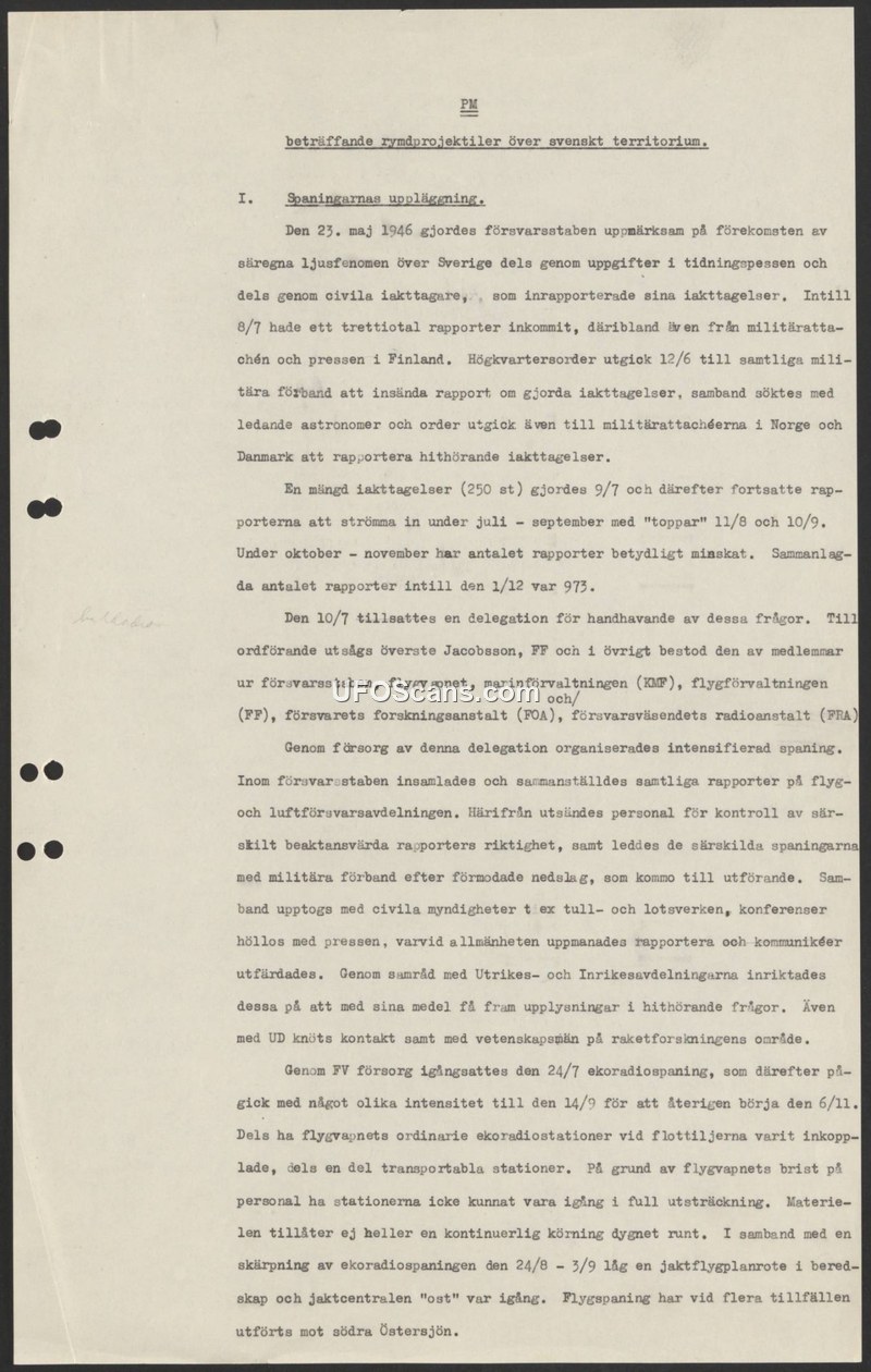 This memorandum details the Swedish military's response to reports of 'peculiar light phenomena' observed over Swedish territory beginning in May 1946. Initially alerted by press reports and civilian observations, the Defense Staff (försvarsstaben) issued orders on June 12, 1946, for all military units to report sightings. By July 8, approximately thirty reports had been received, including information from military attachés and the press in Finland. Following a surge in reports—totaling 250 on July 9 alone—a dedicated delegation was established on July 10, 1946, chaired by Colonel Jacobsson. This delegation included representatives from the Defense Staff, the Air Force, the Naval Administration, the Air Administration, the National Defense Research Institute (FOA), and the National Defense Radio Institute (FRA). The delegation organized intensified surveillance, including the collection and analysis of reports, investigations into potential crash sites, and coordination with civilian agencies such as customs and pilot services. Public cooperation was sought through the press. Furthermore, the Air Force initiated radar surveillance on July 24, which continued with varying intensity through September and resumed in November, despite challenges regarding personnel shortages and equipment limitations. By December 1, 1946, a total of 973 reports had been documented.