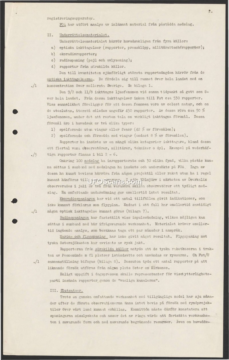 This document, produced by the Swedish National Defence Research Institute (FOA), provides an assessment of aerial phenomena and alleged impact sites reported over Sweden. The intelligence was gathered from four primary sources: optical observations, radar reports, radio monitoring, and other special sources. The vast majority of reports were optical, with a notable concentration over central Sweden. Two major events occurred on July 9 and August 11, involving light phenomena observed across the country, resulting in approximately 530 reports. After excluding potential celestial phenomena, about 450 reports remained, with roughly half describing light phenomena and the other half describing physical objects. These objects were categorized primarily as spindle-shaped, with or without wings or fins. FOA investigated approximately 100 reported impact sites and 30 physical findings, but none could be definitively linked to projectiles or rockets. Radar monitoring occasionally detected signals that could not be explained as aircraft, though only one instance correlated with an optical sighting. Radio monitoring identified pulse transmissions that might be related to the activity, though further analysis was required. Intelligence reports suggested that German rocket bases near Peenemünde were being restored and utilized by the Soviets, with similar activities suspected east of Kirkenes. Ultimately, the committee concluded that after seven months of investigation, no evidence of space projectiles had been obtained, and they recommended discontinuing the current form of investigation due to limited resources and lack of results.