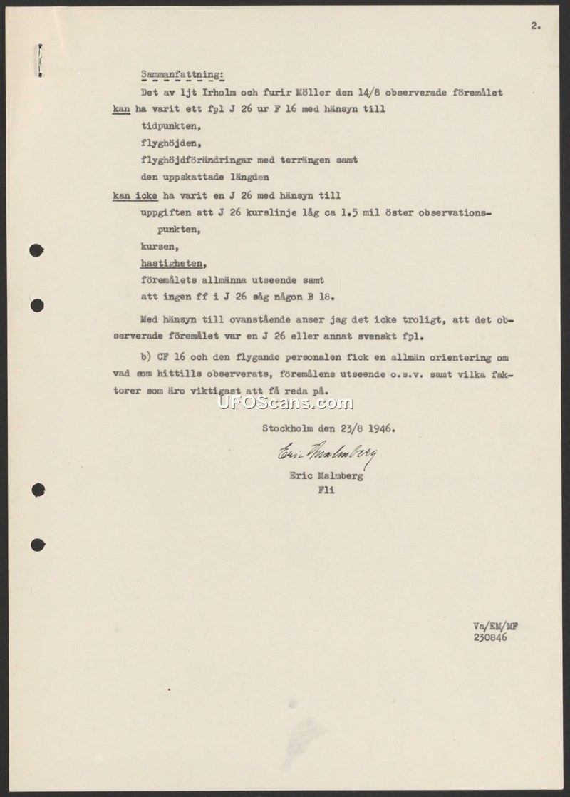 This document, dated August 23, 1946, in Stockholm, provides a summary assessment by Eric Malmberg of F11 regarding an aerial object observed on August 14, 1946, by Lieutenant Irholm and Sergeant (furir) Möller. The report evaluates whether the observed object could have been a J 26 aircraft from the F 16 wing. Malmberg notes that while certain characteristics—specifically the time of the observation, the flight altitude, altitude changes relative to the terrain, and the estimated length—might suggest a J 26, other critical factors contradict this conclusion. Specifically, the report cites the object's course, speed, general appearance, and the fact that no B 18 aircraft were observed by J 26 pilots as evidence against the identification. Furthermore, it is noted that the J 26 flight path was approximately 1.5 Swedish miles (mil) east of the observation point. Consequently, Malmberg concludes that it is unlikely the object was a J 26 or any other Swedish aircraft. The document concludes by stating that CF 16 and the flight personnel were provided with a general orientation regarding previous observations, the appearance of the objects, and the key factors required for future investigations.