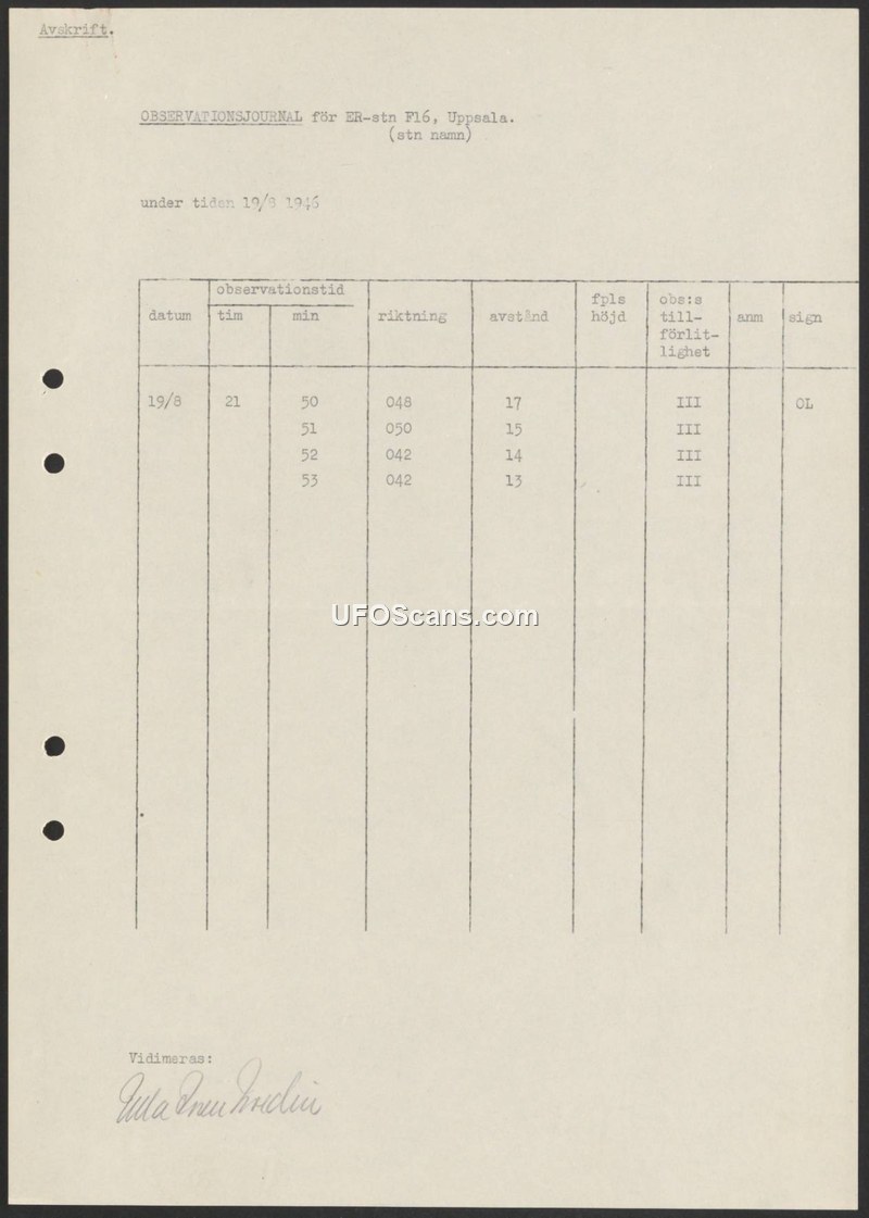 Observation Journal for ER-stn F16, Uppsala, 19 August 1945