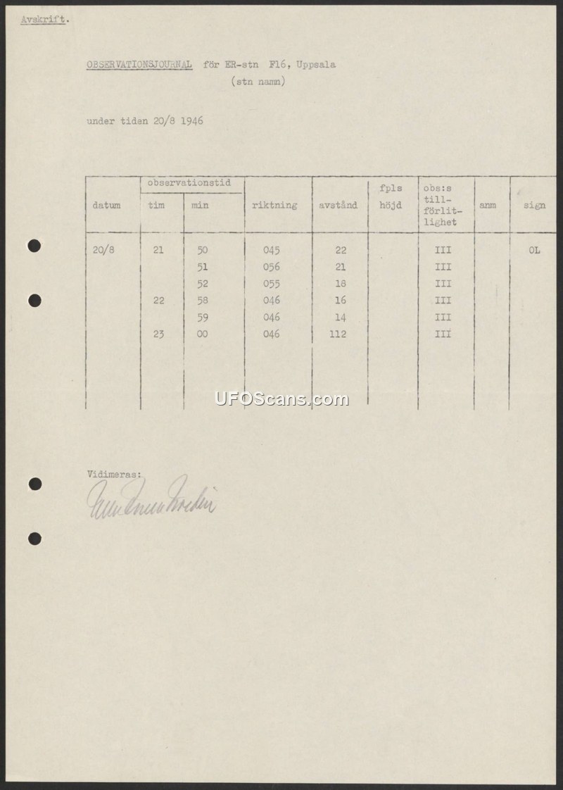 This is an observation log from the Swedish F16 station in Uppsala dated August 20, 1946. It records a series of data points regarding unidentified aerial observations.