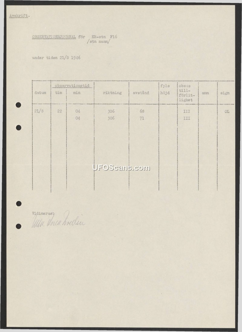 This document is a transcript of an observation journal from the Swedish military station ER-stn F16. The header indicates the journal covers the period of March 21, 1946. The table within the document records a specific observation occurring on August 21 at 22:04. The recorded data includes a direction of 306 degrees and two distinct values for distance/altitude, listed as 68 and 71. The reliability of the observation is categorized as 'III'. The document is signed with the initials 'OL' and includes a certification of the copy at the bottom.
