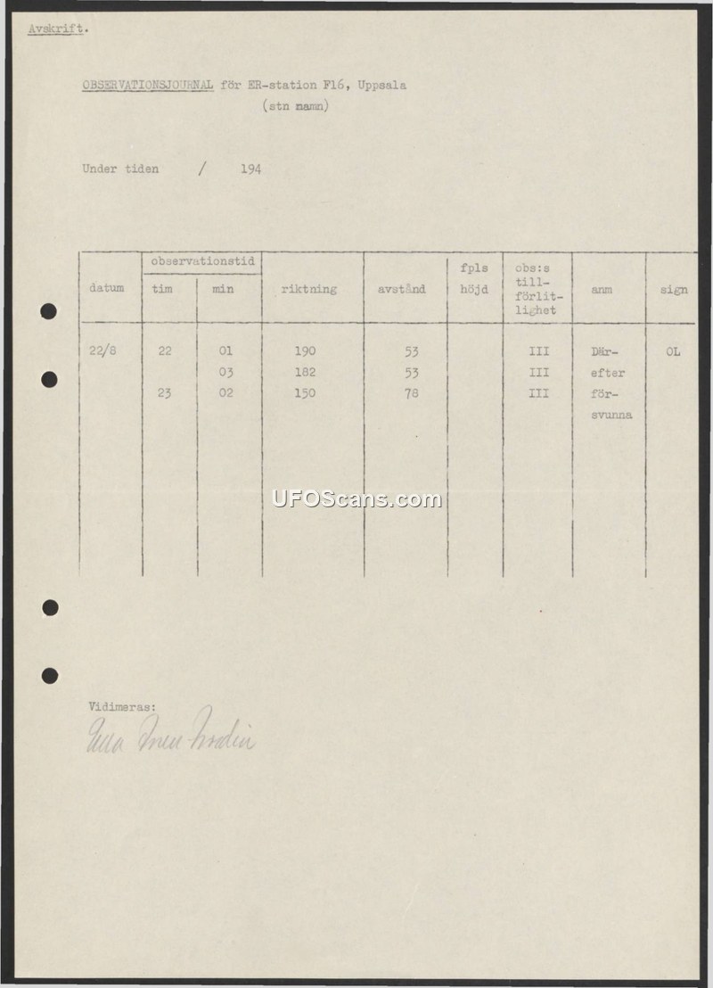 An observation log from ER-station F16 in Uppsala, Sweden, documenting three aerial observations on August 22nd. The entries note the direction, distance, and the subsequent disappearance of the observed subjects.