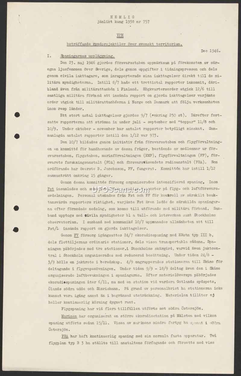 This document outlines the Swedish military's administrative and operational response to 973 reports of unidentified light phenomena observed over Sweden between May and December 1946. It details the formation of a multi-agency committee and the deployment of radar and ground surveillance to investigate these events.