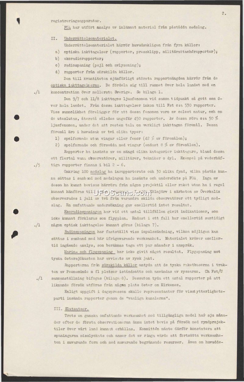 This document, produced by the Swedish National Defence Research Institute (FOA), provides an assessment of aerial phenomena and alleged crash reports occurring over Sweden. The intelligence material is categorized into four sources: optical observations, radar reports, radio monitoring, and reports from special sources. The vast majority of reports are optical, with a concentration in central Sweden. Specifically, reports from July 9 and August 11 resulted in approximately 530 submissions to the Defence Staff (Fst). After excluding phenomena of a celestial nature, approximately 450 reports remained, with about 50% describing light phenomena and the remainder describing physical objects, primarily spindle-shaped, with or without wings. The FOA investigated approximately 100 reported crash sites and 30 physical findings, but none could be attributed to rockets or projectiles, including a specific incident at Lake Kölmjärv near Överkalix. Radar monitoring provided some indications that could not be explained as aircraft, though only one instance correlated with an optical sighting. Radio monitoring identified pulse transmissions that required further analysis. The report notes that maritime and aerial surveillance of the German Baltic coast has been hindered by Russian fighter activity, and there are indications that former German rocket bases in the Peenemünde area have been refurbished and are being used by the Russians. Similar activities are suspected near Kirkenes. Ultimately, the committee concludes that after seven months of investigation, there is no evidence of foreign space projects or rockets over Swedish territory. Consequently, the committee deems the current surveillance efforts to be of little value given the limited resources available.