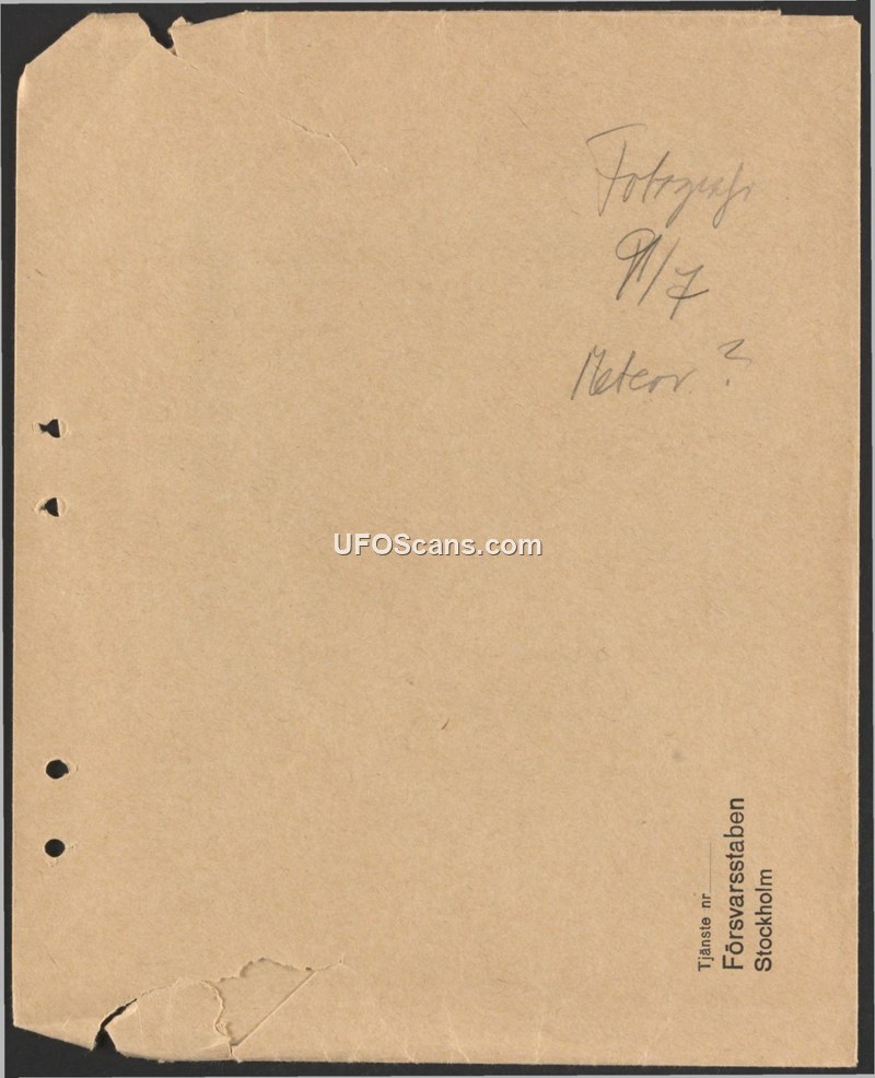 This document is a brief administrative note originating from the Swedish Defence Staff (Försvarsstaben) in Stockholm. It consists of a handwritten notation on a file cover or document sleeve. The text identifies a photograph taken on the 9th of July and poses a question regarding whether the subject of the photograph is a meteor. No further details, descriptions, or investigative conclusions are provided in the document.