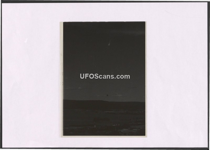 The document consists of a single photographic image depicting a landscape at twilight or night. In the upper portion of the frame, a small, light-colored, elongated object is visible against the dark sky. Below this, a darker, indistinct shape is positioned over a horizon line that separates the sky from a lower, shadowed terrain. No textual information, dates, locations, or official markings are present on the document to provide context regarding the origin, date, or nature of the sighting.