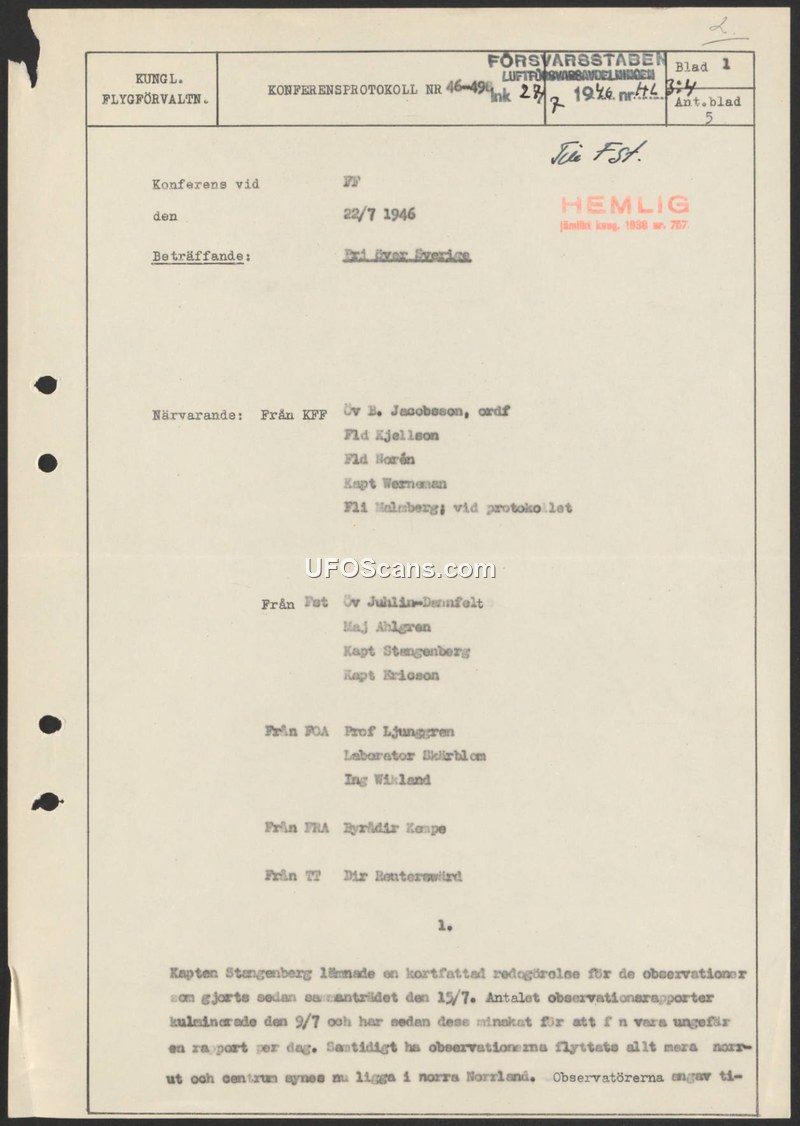 This document is a conference protocol dated July 22, 1946, issued by the Royal Air Force Administration (Kungl. Flygförvaltningen) in Sweden. The meeting, held under the classification 'HEMLIG' (Secret), involved representatives from various Swedish defense and research organizations, including the Defense Staff (Fst), the National Defense Research Institute (FOA), the National Defense Radio Establishment (FRA), and the Swedish News Agency (TT). The primary purpose of the meeting was to discuss the ongoing situation regarding aerial observations reported over Sweden. During the proceedings, Captain Stangenberg provided a brief account of the observations recorded since the previous meeting on July 15. He noted that the volume of reports had reached a peak on July 9 and had subsequently declined to a rate of approximately one report per day. Furthermore, he observed a distinct geographic trend in the sightings, noting that the activity had shifted progressively northward, with the current center of reported activity appearing to be located in northern Norrland.