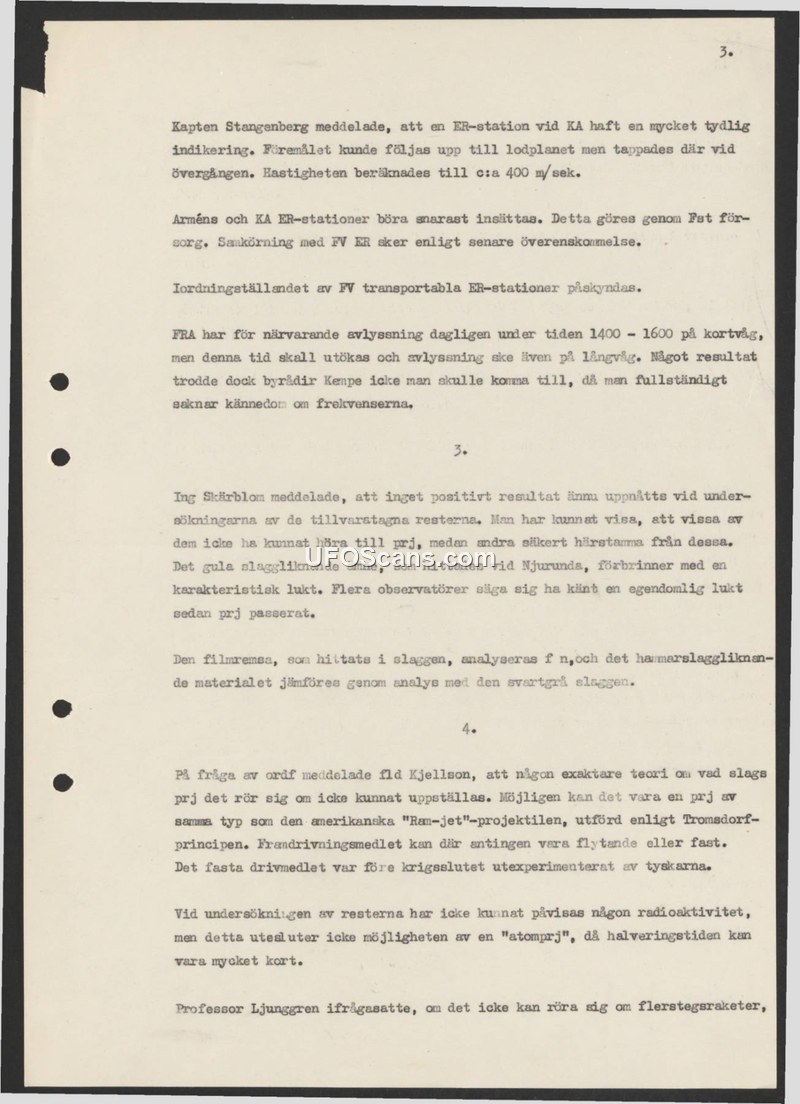 This document consists of briefing notes regarding the investigation of unidentified aerial objects and the analysis of recovered materials. A report from Captain Stangenberg details a radar contact at a KA station where an object was tracked until it reached the vertical plane and was subsequently lost; its speed was estimated at 400 meters per second. The document notes that military and KA radar stations are to be deployed, and the Swedish Air Force (FV) is accelerating the preparation of transportable radar stations. The National Defence Radio Establishment (FRA) is currently monitoring shortwave frequencies between 1400 and 1600 hours, with plans to expand to longwave, though Bureau Director Kempe expressed skepticism about success due to a complete lack of knowledge regarding the frequencies used by the objects. Regarding physical evidence, Engineer Skärblom reported that no positive results have been reached in the analysis of recovered remains, though some materials have been confirmed as related to the objects. A yellow, slag-like substance found at Njurunda emits a characteristic odor, which several observers also reported smelling after a projectile passed. A film strip found within the slag is currently being analyzed. During a discussion, Fld Kjellson stated that no precise theory regarding the nature of the projectiles has been established, though he suggested they might be similar to American 'Ram-jet' projectiles based on the Tromsdorf principle, which could utilize either liquid or solid fuel. While no radioactivity was detected in the remains, the possibility of an 'atomic' projectile remains, as the half-life could be very short. Finally, Professor Ljunggren questioned whether the objects could be multi-stage rockets.