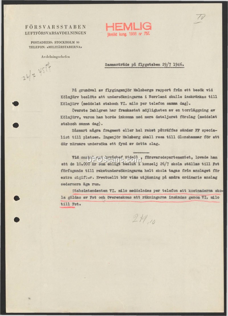 Minutes from a 1946 Swedish Air Staff meeting detailing the administrative and financial procedures for investigating rocket sightings in Kölmjärv and Glanshammar.
