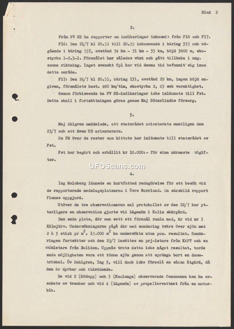 This document, labeled 'Blad 2', details military reports and investigations regarding unidentified aerial phenomena in Northern Sweden during July 1947. It begins by summarizing radar reports from air wings F16 and F17. On July 21, F16 tracked an object between 20:51 and 20:55, noting its movement, altitude of 3800 meters, and varying echo strength. On July 24, F17 tracked an object at 20:55 with a speed of 480 km/h. The report notes that these FV ER-indications were not initially submitted to the General Staff (Fst) due to an oversight, but future reporting will be handled by Major Söderlindh. Major Ahlgren confirmed that the government and the Ministry for Foreign Affairs (UD) were briefed on the situation, and a memorandum regarding recovered remains was submitted to the government. The General Staff requested and received 10,000 SEK for related expenses. Engineer Malmberg provided a summary of a visit to reported crash sites in Northern Sweden. While three observations were recorded in a protocol on July 22, an additional observation was made at Lägenön. The only site where an object was reported to have fallen was Kölmjärv. Extensive sonar searches of the lake were conducted without success. Further searches were planned for July 29, involving a search aircraft from KÄFT and a metal detector from Boliden. Engineer Malmberg noted that if these efforts failed, the only remaining option would be to drain the lake, though Officer Dahlgren of Ing 3 advised against this due to the high cost and time involved. Finally, the report suggests that the phenomena observed at Rödupp and Kamlunge may have been caused by whirlwinds, while the observation at Lägenön may have been caused by propeller wash from a motorboat.