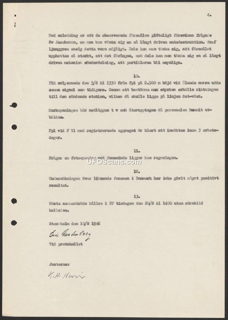 This document, dated August 10, 1946, in Stockholm, serves as a record of proceedings regarding the investigation of unidentified aerial phenomena. The text begins by referencing a discussion with a Mr. Jacobsson and a Professor Ljunggren concerning the potential for 'autodestruction' of observed objects, or alternatively, the possibility that objects could heat up to the point of disintegration or become invisible. The report notes a specific radar detection by FRA on August 5, 1946, at 1330 hours, involving an aircraft at an altitude of 2,500 meters near the northern tip of Öland. The signal was consistent with previous observations, and calculations were made to determine the direction of the transmitting station. The document further states that ground observation efforts are to be suspended until personnel have completed training. It is noted that equipment for recording is expected to be installed at F 11 within three working days. Regarding aerial photography of Peenemünde, the matter is currently with the government. Additionally, investigations into similar phenomena in Denmark have not produced any positive results. The document concludes by scheduling the next meeting for August 20, 1946, at 1400 hours.
