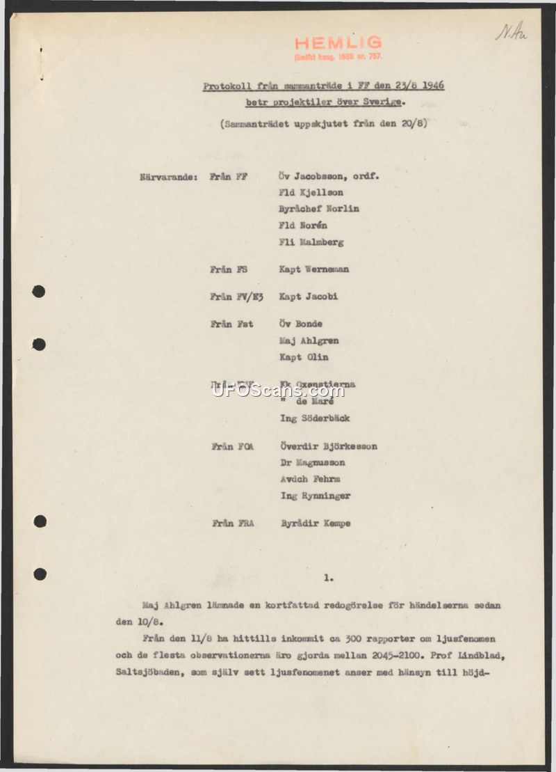 This document is a record of a meeting held by the Swedish military (FF) on August 23, 1946, regarding projectiles observed over Sweden. The meeting, which had been postponed from August 20, was attended by representatives from various military and research branches, including FF, FS, FV/E3, Fst, KMF, FOA, and FRA. Major Ahlgren provided a brief account of events that had transpired since August 10. It was reported that since August 11, approximately 300 reports concerning light phenomena had been received. The majority of these observations were noted to have occurred between the hours of 20:45 and 21:00. The document also mentions that Professor Lindblad of Saltsjöbaden, who personally observed the light phenomenon, provided an assessment regarding its altitude.