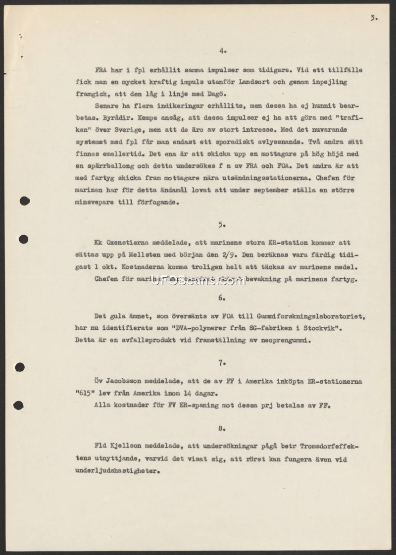 This document, consisting of excerpts from a larger report, details various technical and intelligence activities in Sweden. The first section discusses the detection of signals by the FRA, noting that while these signals are not related to general traffic over Sweden, they are of significant interest. Proposed methods for better monitoring include using high-altitude receivers on barrage balloons and ship-based receivers. The Swedish Navy is assisting by providing a minesweeper for this purpose. Subsequent sections report on the installation of a large ER-station at Mellsten, expected to be operational by October 1st, and the increased security measures for naval vessels. A chemical analysis of a yellow substance sent to the Rubber Research Laboratory identified it as DVA-polymers, a byproduct of neoprene manufacturing at the SG-factory in Stockvik. Furthermore, the document mentions the procurement of '615' ER-stations from the United States, which are expected to arrive within 14 days, with costs covered by the FF. Finally, it notes ongoing research into the Tromsdorff effect, specifically regarding its utility at subsonic speeds.