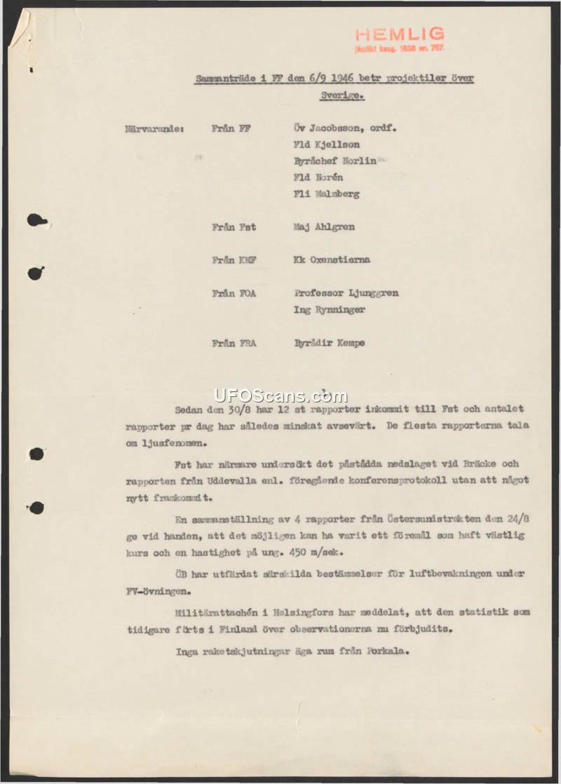 This document records the minutes of a meeting held on September 6, 1946, by the FF regarding the ongoing situation of unidentified projectiles over Sweden. The attendees included representatives from various military and research bodies, including Fst, KMF, FOA, and FRA. The committee noted that the volume of reports had declined significantly since August 30, 1946, with the majority of remaining reports describing light phenomena. The committee reviewed previous investigations into a reported impact at Bräcke and a report from Uddevalla, concluding that these inquiries provided no new information. A specific analysis of four reports from the Ostersund area dated August 24, 1946, suggested the possibility of an object traveling on a westward course at a speed of approximately 450 meters per second. The meeting also addressed administrative and security measures: the Supreme Commander had issued new regulations for air surveillance during Air Force exercises, and it was noted that the military attaché in Helsinki had reported that Finnish authorities had prohibited the release of statistics regarding observations. Finally, the committee confirmed that no rocket launches were occurring from Porkala.