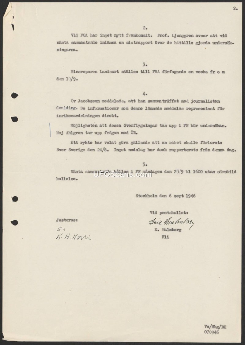 This document consists of the minutes from a meeting held on September 6, 1946, in Stockholm. The record indicates that the FOA (Försvarets forskningsanstalt) had not received any new information regarding ongoing investigations. Professor Ljunggren announced his intention to submit a final report on the investigations conducted thus far at the next meeting. The document also notes that the minesweeper 'Landsort' was placed at the disposal of the FRA (Försvarets radioanstalt) for one week starting September 10. Colonel Jacobsson reported on a meeting with a journalist named Goulding, and it was decided that the information provided by the journalist should be communicated directly to the relevant department. Furthermore, the committee discussed the possibility of raising the issue of aerial overflights with the United Nations, with Major Ahlgren tasked to discuss this with the Supreme Commander (ÖB). Finally, the document addresses a rumor concerning a rocket that was allegedly lost over Sweden on August 24, 1946, clarifying that no impact had been reported for that date. The next meeting was scheduled for September 23, 1946, at 16:00.