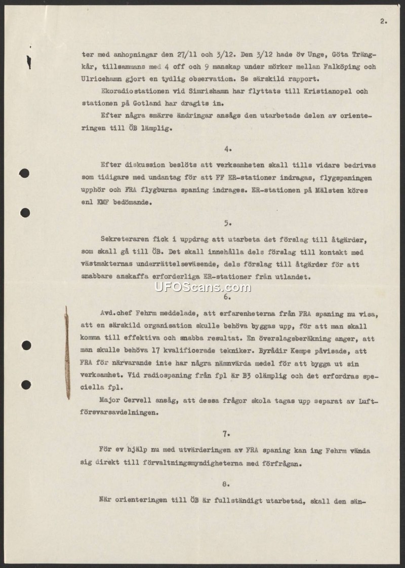 This document, which appears to be a page from a set of meeting minutes, details administrative and operational decisions regarding Swedish military surveillance activities. It references a specific observation made on December 3rd by an officer named Unge from the Göta Trängkår, along with four officers and nine enlisted personnel, between Falköping and Ulricehamn; a separate report on this incident is mentioned. The document notes the relocation of a radio station from Simrishamn to Kristianopel and the closure of a station on Gotland. It further records a decision to continue operations as previously established, with the exception of discontinuing certain FF ER-stations, aerial surveillance, and FRA airborne surveillance. The ER-station at Mälsten is to be operated according to KMF's assessment. The secretary was tasked with preparing a proposal for the Supreme Commander (ÖB) regarding contact with Western intelligence services and the acquisition of ER-stations from abroad. Department Head Fehrm reported that FRA surveillance requires a specialized organization and 17 qualified technicians to be effective. Bureau Director Kempe noted that FRA currently lacks the funds for such expansion. Major Cervell suggested that these matters be addressed separately by the Air Defense Department. Finally, it is noted that Fehrm may contact administrative authorities directly for assistance with the evaluation of FRA surveillance.