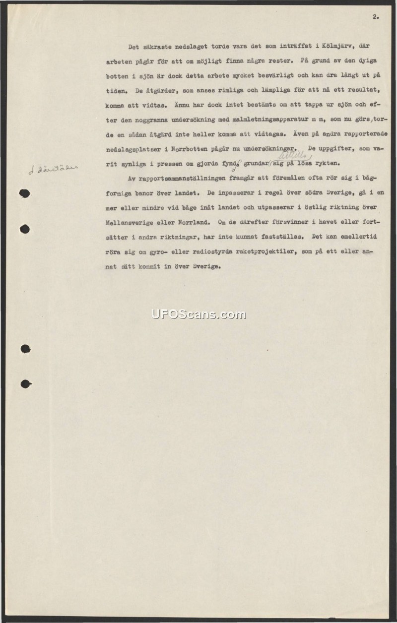 This report summarizes investigations into aerial impact sites in Sweden, specifically Kölmjärv, and characterizes the observed flight patterns of the objects as potentially being gyro- or radio-controlled rocket projectiles.
