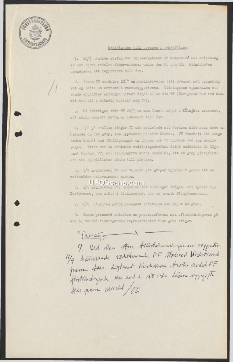 This document outlines the Swedish Defence Staff's communication strategy for handling public rocket sightings in 1947. It details how the military centralized press inquiries and provided official explanations for physical findings to manage public interest.