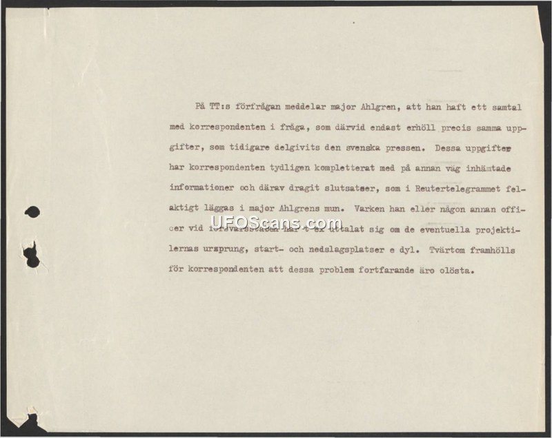 This document serves as a formal clarification regarding statements attributed to Major Ahlgren in a Reuter telegram. Following an inquiry from TT, Major Ahlgren confirmed that he had spoken with a correspondent, but that he only provided the same information previously released to the Swedish press. The document asserts that the correspondent supplemented this information with data obtained from other sources and drew conclusions that were incorrectly attributed to Major Ahlgren in the Reuter report. It is explicitly stated that neither Major Ahlgren nor any other officer at the Defense Staff (försvarsstaben) has made statements regarding the origin, launch sites, or impact sites of the projectiles in question. On the contrary, the correspondent was informed that these problems remain unsolved.