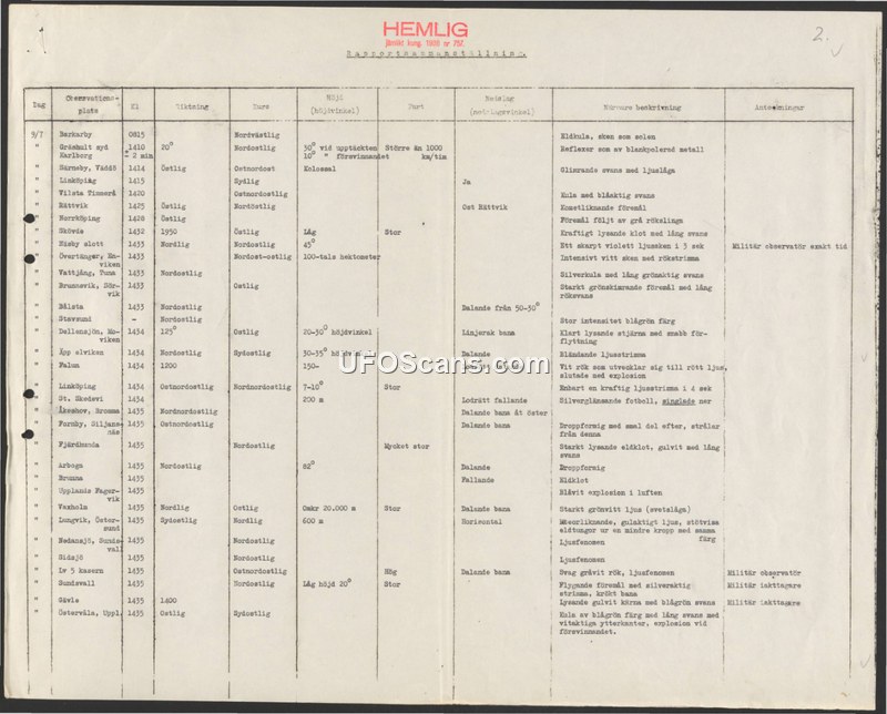 A classified Swedish military log from July 9, 1938, documenting a series of aerial sightings across Sweden. The reports describe various luminous objects, fireballs, and metallic-looking phenomena with distinct tails and explosive characteristics.
