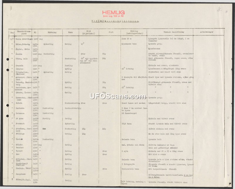 A secret 1938 Swedish military compilation of multiple aerial sighting reports from July 9, 1938. The document details various unidentified objects observed across Sweden, noting their shapes, light characteristics, and movement patterns.