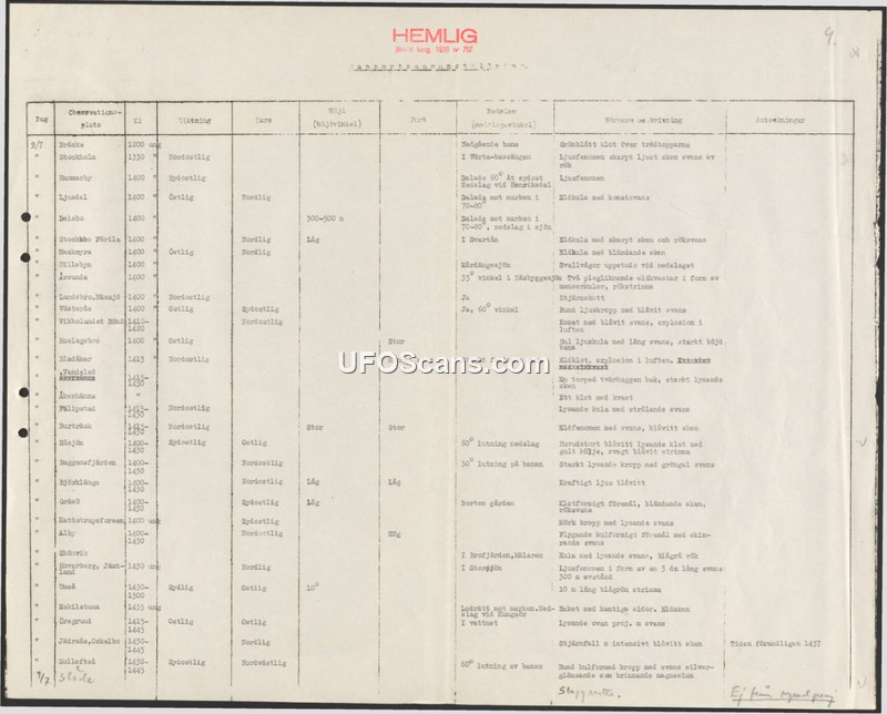 A secret 1938 Swedish military report summarizing multiple sightings of unidentified aerial phenomena, including fireballs and glowing objects, observed across the country on July 9th.